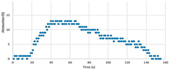 The sensor was tested in a dynamic setup composed of two mass flow controllers (MFCs Dwyer GFC-2102), one controlling the flow of clean air and the other controlling the flow of saturated nitrobenzene vapor, obtained from a bubbler at constant temperature and constant pressure. Both MFCs are controlled from MATLAB through a microcontroller (PIC24FV16KM202) that sets the references to the MFCs, defining the composition of the nitrobenzene-clean air mixture. As expected, the proposed differential approach guaranteed very good sensitivity and fast response from the electronics side while providing high-level input signals. Figure 11 shows the sensor response after a 20-second exposure to minute NB vapors.
