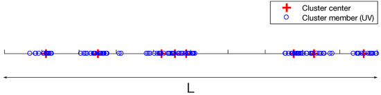 We consider a UV sensor network in one-dimensional space with the length of L as shown in Figure 1, where the UVs are distributed in clusters. In other words, there exist multiple clusters for the swarm sensing applications, each of which consists of a group of UVs. We assume that each UV communicates with other UVs in the same cluster, while the UVs across clusters do not communicate directly. The locations of the UVs in the 1D linear space are modelled by a TCP, where the cluster centers follow a homogeneous Poisson point process (PPP) with density . In addition, the cluster members (UVs) are independent and identically distributed (i.i.d.) according to a symmetric normal distribution with variance around each cluster center with the Gaussian density function of the UV locations relative to a cluster center as
