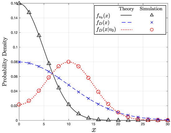 Figure 2 shows the three PDFs: , , and in Equations (6)–(8), respectively. For the conditional PDF of D, , we set . The solid, dotted, and dashed lines represent the theoretical graphs based on the derived PDFs. On the other hand, the three differently shaped markers indicate the corresponding simulation results. As shown in the figure, the analytical results are consistent with the simulation results for the entire range of x, which verifies our analysis.