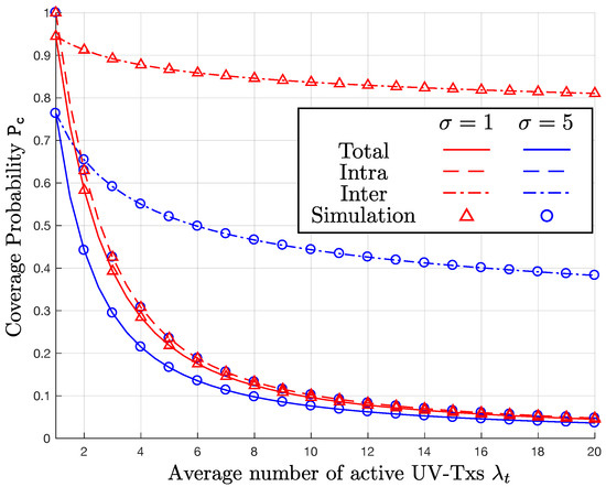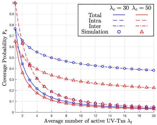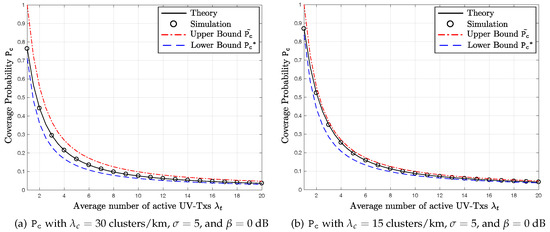 Figure 3 shows the coverage probability Pc with different average numbers of simultaneously active UV-Txs . Figure 3a,b corresponds to and 15 clusters/km, respectively. For both cases, we use and dB. The solid lines indicate the theoretical results of the coverage probability Pc, while the circles represent the simulation results. Moreover, the dashed and dash-dotted lines correspond to the lower and upper bounds, and , respectively. As expected, in both Figure 3a,b, all of the curves decrease, as increases, because the number of the intra-cluster and inter-cluster interferers increases.