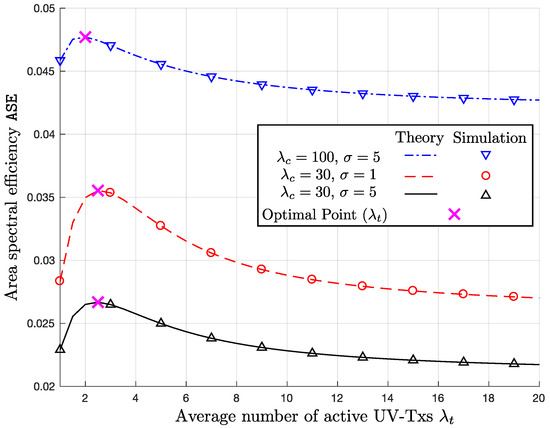 Figure 6 and Figure 7 show ASE versus graphs. In the both figures, the optimal to maximize ASE for the given system parameters is indicated by the ‘x’-markers. In Figure 6, we observe the impacts of and on ASE. If comparing the two curves with and 100 clusters/km for the same , ASE increases, as increases, because the decrease in Pc caused by the increase in is not as much as the increase by the multiplicative term of in ASE given in (11). On the other hand, as expected from the previous simulation results regarding Pc, if comparing the two curves with the different but the same , we observe that ASE decreases, as increases. If we look at Figure 7, the higher makes ASE increase, because of in (11). Furthermore, the decrease in ASE with dB is the most rapid, when increases, because the higher implies the tighter SIR requirement.