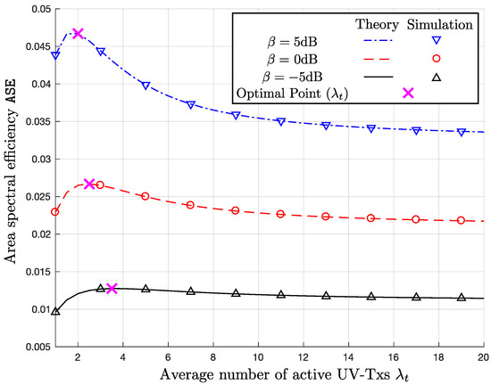 One of the key design issues is to determine the optimal , which means how many simultaneously active UV-Txs we should allow. In Figure 6, the changes in and do not cause significant variation in the optimal . On the other hand, if we decrease the SIR threshold as in Figure 7, the optimal value of increases up to 3.75, because lower can accommodate more simultaneous UVs.