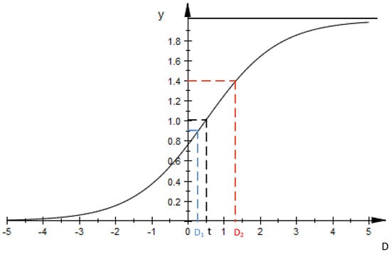 Here, t is a pre-determined threshold; and D is the absolute difference between Xi+1 and Xi over the average value of a number of N sliding-window based most recent data. Since we are interested in knowing whether there exists a sudden environmental change or not, it is reasonable to compare the latest sensed data Xi+1 with the former data Xi in the signal sequence, and then divide the absolute difference between with the mean value of the most recent N data. If D is sufficiently large, it indicates a sudden environmental change. Then a somewhat higher sampling frequency is desired. Additionally, if the value of D is smaller than the threshold t, which means the value changes are not significant enough, the sampling frequency can be reduced in view of the relative stability of the monitored data. Hence, the theoretical value of y is actually smaller than 2 but greater than y(0), that is, since the smallest value of D will not be a number smaller than 0 in data sensing process, the value of y(0) is essentially greater than 0 regardless of the value of t. A representation of the revised sigmoid function is presented in Figure 1. It is found the value of y in the simulation is mostly a number either slightly smaller than 1 (e.g., when D equals to D1) when the sensed data numerically remain stable or greater than 1 (e.g., when D equals to D2) when the sensed data abruptly change.