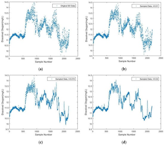 (a) Original dissolved oxygen (DO) Data; (b) Sampled DO data with t = 0.01; (c) Sampled DO data with t = 0.015; (d) Sampled DO data with t = 0.02.
