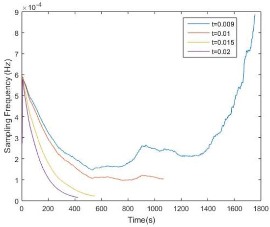 The frequency trend for each corresponding threshold is also shown in Figure 4. It is believed that when the threshold is set to a proper number, (i.e., t = 0.01), the sampling frequency will eventually converge or remain at a stable level. However, it is also found out that when the threshold is set to a value smaller than 0.01, for instance, when t = 0.009, the frequency trend will not converge. This happens mainly because the value of D(i) in most iterations is greater than the threshold, which results in a constant increase in the sampling frequency. This also means the dynamically changed sampling frequency is not sensitive to the data change, which in fact is not a desired outcome. Additionally, when t = 0.015 and t = 0.02, compared to the case when t = 0.01, the sampling frequency is more sensitive to the data change, and as a consequence, more energy will be conserved since the sampling frequency in each iteration is lower than the initial sampling frequency.