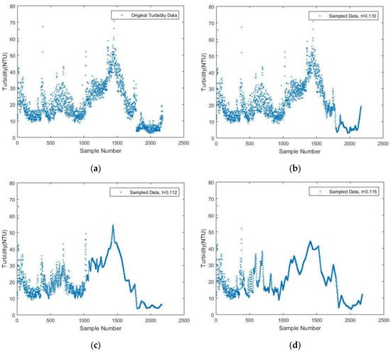 (a) Original Turbidity data; (b) Sampled Turbidity data with t = 0.110; (c) Sampled Turbidity data with t = 0.112; (d) Sampled Turbidity data with t = 0.115.