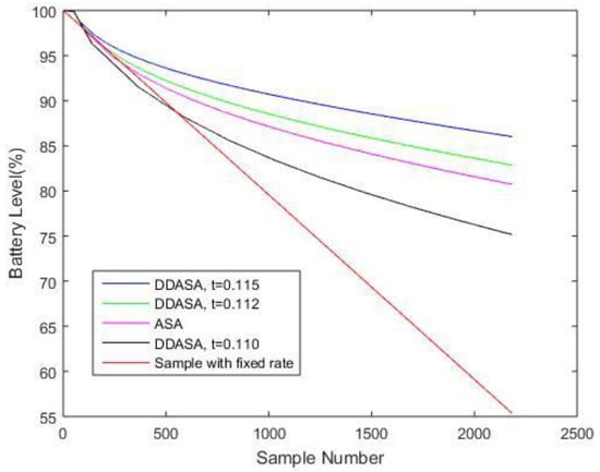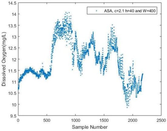 A comparison of algorithm performance is presented in Figure 7 and Figure 8, and Table 3. Using the same sequence of DO data, a traditional ASA is implemented as well. A set of parameter values are chosen as empirically suggested in paper []. Figure 7 shows the reconstructed signal using ASA can still indicate the fluctuation of the DO compared to the original signal in Figure 2a. The NME for the results is 5.31% with a number of 637 samples. The performance is similar when t = 0.115 for analyzing DO data in the proposed DDASA. However, to achieve a similar result, the ASA uses 637 samples in total, which proves to be more energy-consuming in contrast to the proposed DDASA, where only a number of 320 is needed. Figure 8 presents the comparison of energy consumption over time for ASA and for different values of predetermined thresholds of DDASA. Considering the fact that a more frequent sampling process will equivalently increase the energy consumption for storing and transmitting data, to simplify the comparison process, only the energy consumed for keeping a node active and for data acquisition is considered. Moreover, the active time of the node in each case will be equivalent, which means it should be equal to the total length of time for a fixed rate sampling process. The specific number of energy consumption for different sensing activities can be found in [], which is the basis for obtaining the simulation results in Figure 8. In Table 3, a performance comparison is provided, in which the DDASA outperforms the ASA when t = 0.115 and t = 0.112 with respect to the remaining battery level.