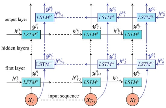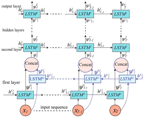 where represents the parameters ( of the LSTM cells for layer , as shown in Equations (3)–(6). Any layer in the upper layers uses the output of the lower layer as its input: