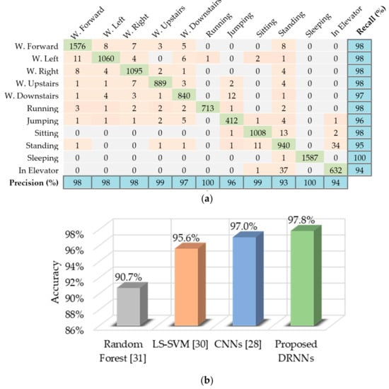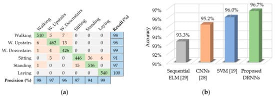 We found that the unidirectional DRNN model with four layers yields the best results for the USC-HAD dataset. Figure 9a presents the classification results for the test set in the form of a confusion matrix, along with the per-class recall and precision results. The proposed method achieved better overall accuracy than other methods, such as CNNs [], least squares support vector machine (LS-SVM) [], and random forest [], as shown in Figure 9b.