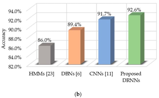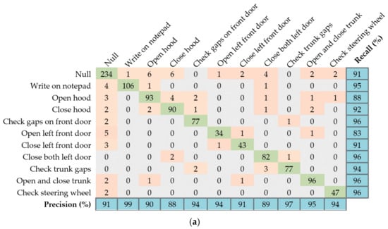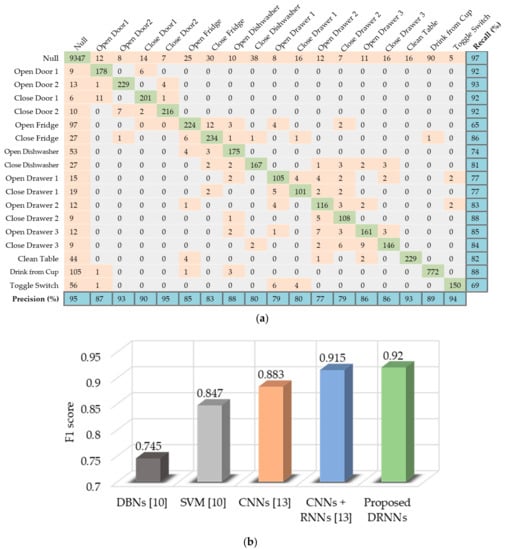 We found that the cascaded DRNN model yields the best results for the Skoda dataset. The model is built using one bidirectional layer and two upper unidirectional layers. Figure 12a presents the classification results for the test set in the form of a confusion matrix, along with the per-class recall and precision results. The proposed method results in an overall accuracy of 92.6%, outperforming other methods such as HMMs [], DBNs [], and CNNs [], as shown in Figure 12b.