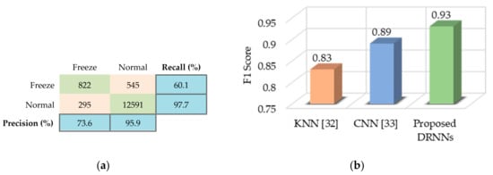 For the Daphnet FOG dataset, we found that the cascaded DRNN model with one bidirectional layer and two upper unidirectional layers yields the best results. Figure 11a summarizes the classification results for the test set. The low values of recall and precision for the “Freeze” class are caused by the dominance of the “Normal” class. However, our proposed method still outperforms other methods, such as k-nearest neighbors (KNN) [] and CNNs [], in terms of F1 score, as shown in Figure 11b.