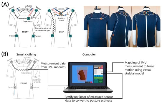 Schematics of IMU-integrated clothes for postural monitoring. (A) The sensor–actuator network, the cutting lines of the garment, and a prototype of the smart clothes. (B) A block diagram of the process of postural monitoring using the proposed smart clothing.