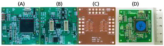 (A) Front and (B) back views of the custom-made IMU sensor module and (C) flexible printed circuit board (FPCB) for interconnection. (D) Combined sensor modules attached on the FPCB.