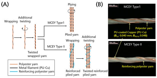 Development of conductive yarn. (A) Illustration of yarn manufacturing process for MCEY Types 1 and 2. (B) Lengthwise images of insulated MCEY (PU-Cu). Yarn Type 1 is a plied yarn of three strands of twisted wrapped yarn, and Yarn Type 2 is a twisted reinforced plied yarn of reinforcing polyester yarn wrapped around three strands of twisted wrapped yarn.