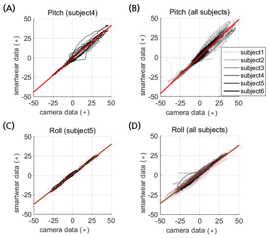 Calibration of the smart wear for (A,B), pitch and (C,D) roll directional tilt of the torso ranging from −40° to 40°. The results of one representative subject (A,C) are followed by data from 6 subjects (B,D), with solid lines in different shades of gray indicating different subjects. The linear regression of each data is depicted as a red line.