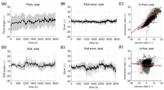 Postural estimation of pitch and roll from the smart wear during an hour of sitting activity. Average temporal trajectories of (A) pitch and (D) roll, and the corresponding temporal error profiles for (B) pitch and (E) roll. Mean values and standard deviation are shown as black solid lines and gray shading, respectively. Correlation between the estimated (C) pitch and (F) roll posture from the smart wear and the measurements from the camera. Different solid lines with different shades of gray indicate different subjects.