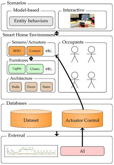 - Bouchard, K.; Ajroud, A.; Bouchard, B.; Bouzouane, A. SIMACT: A 3D open source smart home simulator for activity recognition with open database and visual editor. Int. J. Hybrid Inf. Technol. 2012, 5, 13–32. [Google Scholar]