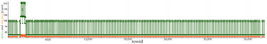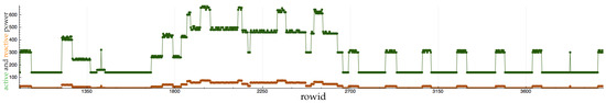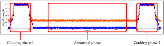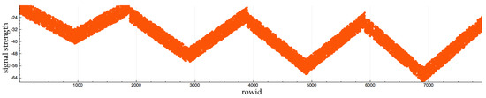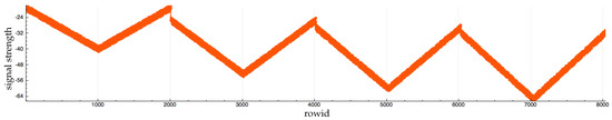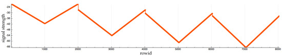 Evolution of RFID signal strength. In rows [0, 2000], the tag is approximately 1 m away from the antenna. In rows [2000–4000], the tag is approximately 4 m away from the antenna. In rows [4000–6000], the tag is approximately 10 m away from the antenna. In rows [6000–8000], the tag is approximately 10 m away from the antenna.