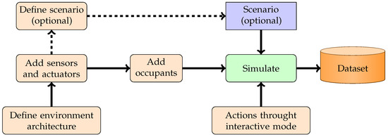 We can use this simulator in different kinds of studies in intelligent environment domain. In the activity of daily living (ADL) recognition field, this simulator can be used to develop a new approach for recognition. Indeed, in this domain, researchers aim to propose solutions to deduce occupants’ activities. ADL recognition methods try to detect activities patterns in data gathered from sensors [38,39]. These solutions have to be accurate, reliable, robust, and not require expensive sensors to be widely implemented.