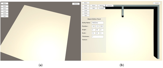 In this paper, we focus on smart home simulation. As presented before, smart homes form a category of IE. In this category, intelligence is added to residences. Smart homes can enhance comfort at home and help frail and disable people to recover autonomy. We can find several smart home simulator propositions in the literature [8,9,10,11,12,13,14,15,16,17,18]. These solutions help researchers to generate datasets to study issues and new approaches in the smart home domain. However, it is important to highlight the fact that simulator features affect the kinds of studies that can be conducted. For example, the nature of sensors and actuators affects experiment possibilities. If a simulator provides users with only contact sensors, researchers cannot study several approaches for activity detection. The consequences are the same if the granularity level of data is too high. Inversely, when a simulator generates the same kind of data as physical sensors, it allows users to study the same approaches as with physical sensors. For example, if it generates radio-frequency identification (RFID) signal strength, researchers can study algorithms based on these devices. If it directly provides an “x, y, z” vector, researchers cannot use the same approaches.