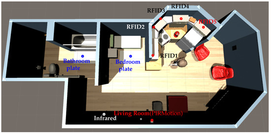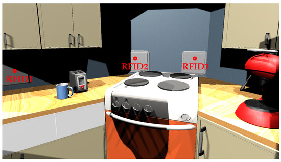 RFID antennas and RFID tags are used in literature to track objects’ locations and deduce occupants’ activities [29,30]. The principle is quite simple. One or several RFID tags are put on objects and several RFID antennas are set in the environment. RFID antennas send signals that are caught by RFID tags in range. RFID tags activate when they receive a signal and answer to the antenna which computes signal strength between it and the tag. Signal strength decreases according to the distance between the two entities. Approaches use signal strength to deduce the objects’ locations.