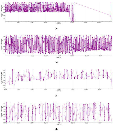 Sample of charts of RFID antenna signal strength for the tag named “TagMug”. This is the raw data of signal strength. (a) Antenna RFID1; (b) Antenna RFID2; (c) Antenna RFID3; (d) Antenna RFID4.