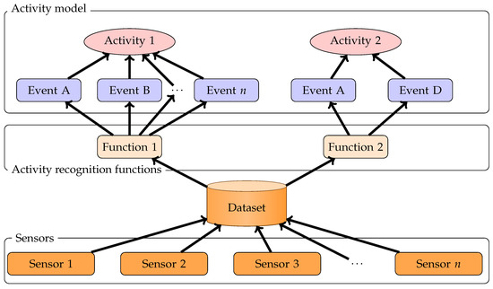One approach in ADL recognition is to define an activity as a set of events. For example, a cooking activity involves a cooker, and the movement of kitchen tools such as knives, pans, spoons. Making coffee implies a coffee machine and a mug. The second step is to identify these events by analyzing data generated by sensors. Basically, event recognition can be seen as a function that takes a vector of sensor data as an argument and it returns events that are recognized. Figure 21 resumes this approach.