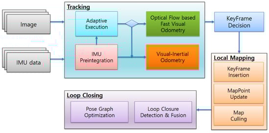 This section describes the basic structure of the visual–inertial SLAM and demonstrates the method of implementation of the adaptive method for the system.