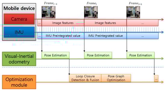 With the development and dissemination of a variety of hardware sensors, SLAM technology is moving toward multi-sensor fusion, which leverages multiple complementary sensors to achieve higher accuracy and robustness. Mobile devices are usually equipped with a variety of sensors, such as a camera, IMU, and GPS. We focus on combining the standard monocular camera and IMU sensor in mobile devices to implement more accurate and stable SLAM systems. The methods for integrating visual information and IMU data are divided into loosely coupled [23,24] and tightly coupled [25,26,27,28] methods, depending on whether image feature information is added to the state vector. The loosely coupled approach usually involves executing visual-based SLAM and inertial-based modules separately and combining the results to estimate the measurements. However, in a loosely coupled method, the monocular SLAM drift problem still exists. In a tightly coupled method, IMU bias can be corrected by adding image feature information to the state vector and the scale of the monocular SLAM can be estimated. This method is more accurate than the conventional single-visual-sensor-based SLAM.