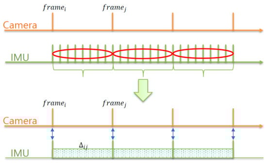 As shown in Figure 3, the preintegration method integrates all the IMU measurements between two frames i and j to represent the motion model. The formula is expressed as follows.