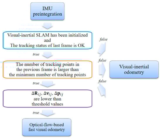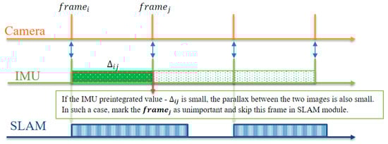If the IMU preintegration value is small, the camera movement changes only slightly, and the parallax between the two images is also small. Such images are relatively unimportant in the SLAM module. As shown in Figure 4, if the IMU preintegration value −∆ij between the current frame j and the previous frame i is calculated and this value is less than the threshold value, we mark the current frame j as unimportant and subsequently estimate the camera pose using our fast VO module. This frame is not processed by the SLAM module. Using this method, we can select the VO module adaptively at run time.