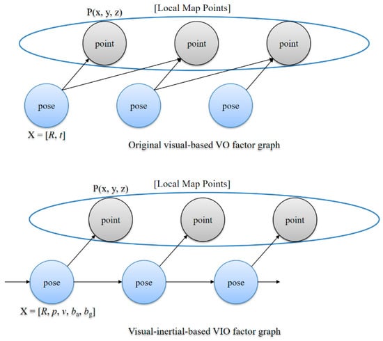 Comparison of the original visual-based VO factor graph and visual–inertial-based VIO factor graph.