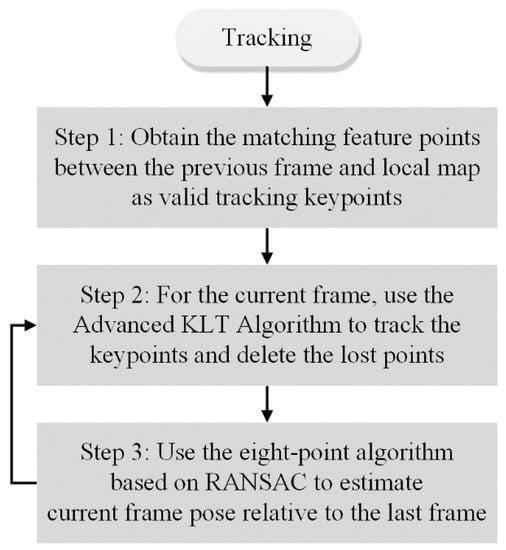 In the second step, a tracking operation based on an advanced Kanade-Lucas-Tomasi (KLT) feature tracking algorithm is performed on the current frame.