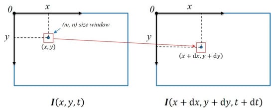 where dx/dt is the motion velocity of the pixel along the x-axis, and dy/dt is the motion velocity along the y-axis, which are denoted as u and v, respectively. Further, ∂I/∂x is the gradient of the pixel in the x-direction and ∂I/∂y is the gradient of the pixel in the y-direction, which are denoted as Ix and Iy, respectively. Furthermore, ∂I/∂t is the change in the image grayscale over time, which is denoted as It. The above expression can be written as