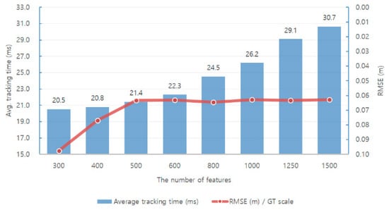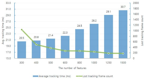 Experimental results show that increasing the number of features used in each frame increases the average tracking time and also increases the system accuracy and robustness accordingly. A direct way to reduce the average tracking time is to reduce the number of features used in each image. Simultaneously, the translation RMSE of the keyframe trajectory increases and the number of lost tracking frames also increases. There is a trade-off between the number of features used in the SLAM system and the accuracy and robustness. Moreover, if the experimental results are classified into three different levels and analyzed, the higher the level, the greater the influence on accuracy and robustness. Moreover, we can observe that the difficult level is significantly affected by the number of feature points.