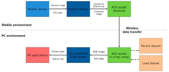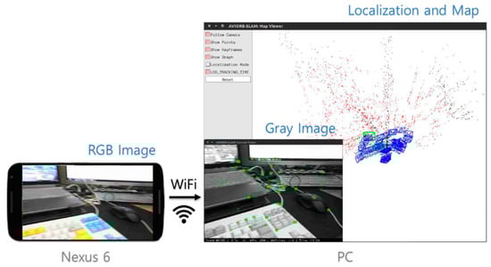 First, we use the OpenCV library to resize and convert the acquired camera image to RGB format on an Android smartphone. The image data and IMU data are transferred to the PC in real time under WiFi connection using the ROS toolkit. We obtained a 15 fps image of size 640 × 480 and 100 Hz IMU data on a Nexus 6 smartphone. After the camera-IMU calibration, the proposed method was tested in a PC environment. Figure 16 shows a screenshot of the proposed AVIO-based SLAM with real mobile device sensor data in a PC environment.