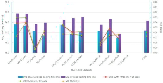Table 5 and Figure 13 illustrate the comparison of the performances of the VIO-based SLAM and the monocular ORB-SLAM. The experimental results for the EuRoC dataset are shown in the same experimental environment with 500 features.