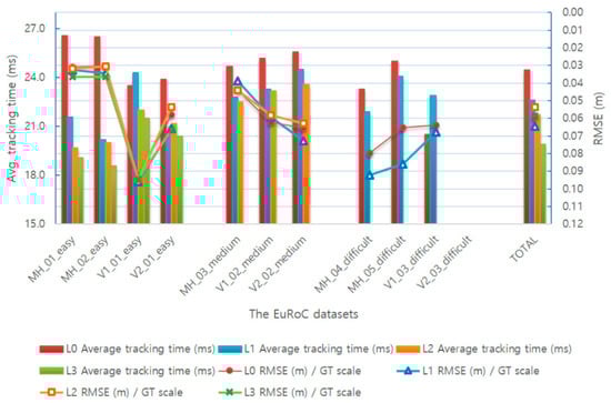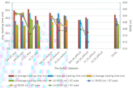 First, the time required for tracking by the optical-flow-based fast VO method and the VIO method was measured and compared in the AVIO-based SLAM. Table 6 provides the average execution time of the two odometry methods of AVIO-based SLAM for the MH_01_easy sequence when the level 1 adaptive execution policy is applied.