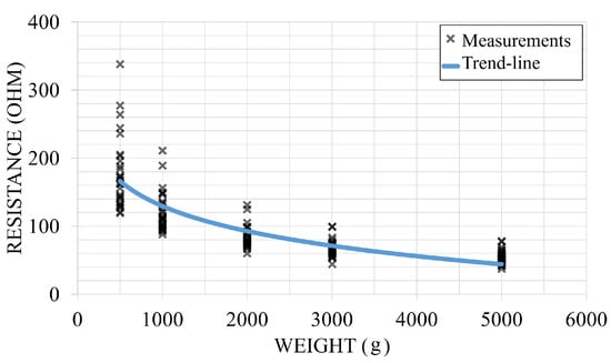 The middle force-sensitive layer is carbonated polymer fabric, and the top and bottom layers are metallic fiber stripes woven into a non-conductive fabric substrate as parallel electrodes. Every cross point of the top and bottom layers is a pressure sensitive point, and the spatial granularity is determined by the pitch distance of the parallel electrodes. The sensor’s resistance change with the pressed force is shown in Figure 1. A probe is pressed on a random cross point, and multiple levels of force are applied. In this prototype we use a 1 cm pitch, 20-by-20 matrix.