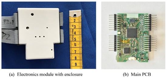 The sensor is scanned and sampled by a custom designed printed circuit board (PCB) built around a dsPIC micro-controller (Microchip Technology, Chandler, AZ, USA), sampling rate is 50 frames per second with Bluetooth data streaming. It is the same hardware platform we used during our work as a smart chair cover in [] as shown in Figure 2. The electronic module operates on either wireless or wired for data transmission. With 3.3 V power supply, the sensing part of the electronics consumes 60 mA during operation, and the Bluetooth consumes 40 mA for data streaming. The sensor fabric are connected to the electronic through standard ribbon cables and 2.54-pitch pin connectors, making it easy to produce. On the smart fabric side, the ribbon cables are soldered onto the metallic fabric stripes.