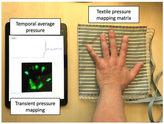 Figure 3 shows the TPM matrix and the real-time data visualizing on a tablet, with a hand pressed in the center. During the construction of the sensor fabric structure, the top and bottom layers of electrode stripes are treated identically; however, on the electronic side, one layer is connected to output ports to provide voltage (stimulus electrodes), and the other layer is connected to analog inputs to measure the voltages (sensing electrodes).