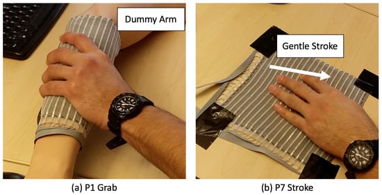 We defined seven gestures as listed in Table 1. Only in P1 - grab, the sensing skin is wrapped around a dummy arm (Figure 4a), and for the rest of the gestures, the sensor is fixed on a flat surface (Figure 4b). This setup should be seen as a pre-stage to mounting the fabric as skin for a robot, constituting a robot-agnostic baseline without the full complexity of uneven surfaces and the robot’s own motions. The focus of our evaluation is to investigate if the sensor can be used to physically distinguish these expressive gestures.