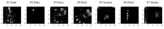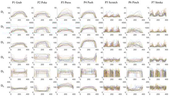 Figure 6 visualizes the temporal sequences of frame descriptors from different classes. One action of each gesture from every person is randomly selected. For comparison purposes, the sequences are scaled to the same 400-sample window using linear interpolation; the original data sequences have different length. The next step is to extract features to distinguish between different classes. For example, in subplot -, P2 Poke has significantly smaller than the other gestures; P5 Scratch and P7 Stroke have distinct higher frequency movements than the other gestures in all the frame descriptors; P1 Grab and P4 Push has higher average value in and than the other gestures.