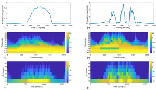 We use fast wavelet transform implemented by the Large Time-Frequency Analysis Toolbox (LTFAT) [], which follows Mallat’s basic filterbank algorithm for discrete wavelet transform []. Figure 8 offers an illustration and comparison of two different source signals going through 5-level and 10-level filterbanks. Essentially, each filterbank iteration calculates a vector of coefficients as results. The calculation uses a mother wavelet, which is scaled and shifted to provide frequency variance and temporal localization. In this study, we used the Daubechies 8 (db8) wavelet as the motherwavelet []. Other standard mother wavelets can also be used in this process; however, once chosen, the mother wavelet should not be changed because the wavelet transform will have different references. Higher iteration targets the higher frequency and finer temporal localization, which results in a longer vector of coefficients. For example, assume the sample frequency is f, with samples, a five-level filterbank discrete wavelet transform as in Figure 8e,f results in wavelet coefficients as shown in Table 2. We define the highest level as J, therefore the coefficients are