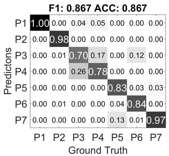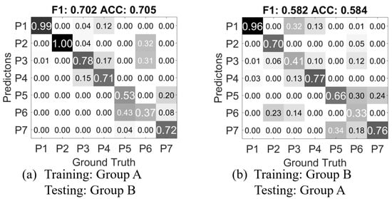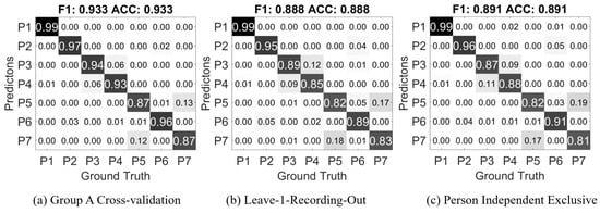 The first result in Figure 9a is from the randomly separated 5-fold cross-validation from all participants in Group A, it is essentially the confusion matrix of the corresponding result from Table 5. The values in the matrix are ratios of the current prediction in the overall ground truth of its class; on the diagonal, the values are the true positive ratio of each class. The F1 score is is calculated as the harmonic mean of the average precision and recall of all the classes; the ACC score is the accuracy, which is the average true positive rate.