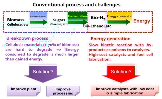 As shown in Figure 1, the convention process to generate energy from biomass, especially electricity, consists of three main processes: (1) scarification (or breakdown process) to convert biomass to smaller components that are easier to be degraded; (2) fermentation to convert these small components to bio-fuels; and (3) energy conversion process that generates electricity from bio-fuels using fuel cells. In order to vastly improve overall efficiency, the scientific portfolio is organized into three core strategies: (1) improve plants; (2) improve processing; and (3) improve catalysts, targeting the three main processes, respectively [,,,,,,,,,,,,,,]. Ideally, crude and abundant fuel sources such as cellulose or starch could be utilized directly []. However, despite the enormous efforts by scientists worldwide, this goal seems too far from real practical implementation. Thus, researchers aim to increase energy density and the degradability of plants such as grasses and other non-traditional oil crops by understanding, and manipulating metabolic flux and genetic modification [,]. Another solution is to improve the breakdown and fermentation processes in which the primitive biomass sources are degraded into smaller sources such as glucose and/or other monosaccharides, and ultimately to bio-hydrogen and bio-ethanol [,,,,,,]. This research trend is focusing on the development of genetically modified microorganisms and efficient low-cost enzymes. Especially, bio-hydrogen and cellulosic ethanol-producing microbes are at the center of this strategy. After breaking down biomass sources into biofuels, the last challenge is utilizing as much as possible, the energy stored in the chemical bonds by energy conversion devices-fuel cells. At this stage, nanotechnology is being employed to improve cell performance, increase durability, and reduce the cost []. For example, precious metal electrocatalysts used are reduced to the nanoscale, ensuring a high catalytic surface area and minimizing the amount of precious metal used to maintain high performance. Thus far, many researchers have been studying inorganic nanostructured catalysts including alloys, bimetallic, and ternary metallics in order to not only reduce the noble metal loading but also create synergistic effects to enhance catalytic performance as well as durability []. Differing from the inorganic approach, a new strategy is focusing on organic-based nanomaterials, mostly carbon-based, as supporting matrices to fine-tune the catalytic activities of low-loading noble or non-noble metals toward desired products []. Graphene, for instance, when coated with cobalt and cobalt-oxide nanoparticles, is reported to be able to catalyze the oxygen reduction reaction on the cathode side of fuel cells, nearly as well as platinum does and is substantially more durable []. A catalyst made of iron nanoparticles confined inside pea-pod-like carbon nanotubes exhibits a high activity and remarkable stability as a cathode catalyst in polymer electrolyte membrane fuel cells [].