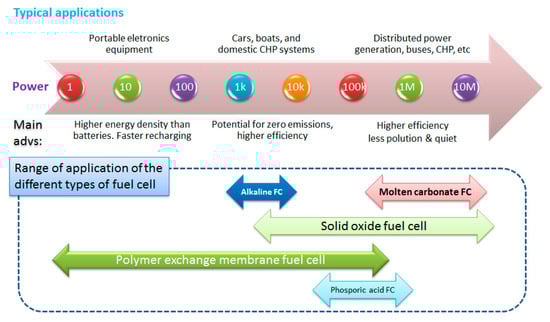 Summary of applications and main advantages of different types fuel cells (CHP stands for combined heat and power systems. The power unit is Watt).