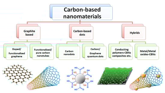 Carbon-based nanomaterials (CBNs), were discovered about 150 years ago, remarkably in 1991 by a physicist, Sumio Iijima of Nippon Electric Company (NEC) Corporation, Japan, who published a ground-breaking paper in Nature on multiwalled carbon nanotubes (CNTs) [], and in 2004 by Novoselov with the mechanical exfoliation of graphite to produce the first single layer graphene []. They have since been thoroughly characterized, and extensively developed for a wide range of fields from industrial applications such as high-strength materials, nanoscale electronic, high efficiency electron emitters, to research including biosensors, drug delivery systems, and tissue scaffold reinforcement []. CBNs have enjoyed this wide application due to their unique combinations of mechanical, optical, thermal, and electrical properties. Graphene, for example, is incredibly strong with the tensile strength of ~130 GPa, for a defect free single layer, Young’s modulus of 1 Tpa, third order elastic stiffness ≈ 2 Tpa; and at the same time is very flexible and light (0.77 mg m−2) with a very high specific surface area (~2630 m2 g−1) []. Figure 3 shows the CBNs that have been significantly used and can potentially be used for biofuel-fed fuel cells.