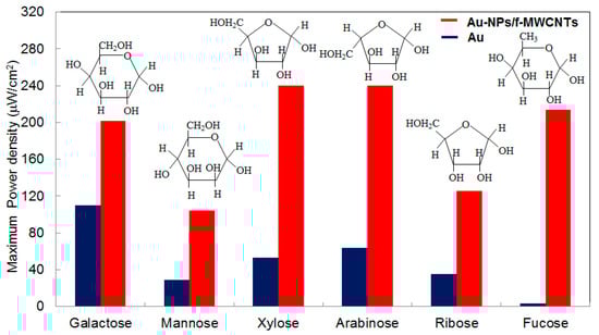 Power density of monosaccharide-based fuel cells using AuNPs/fMWCNTs as anodic catalyst in comparison with bare Au electrode. Reprinted with permission from ref. []. Copyright 2011, Elservier.