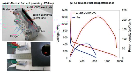 (A) Air-glucose fuel cell prototype and (B) its performance in terms of polarization and power density. Glucose concentration was 0.4 M in 0.3 M NaOH and 0.1 M PBS; temperature was 25 °C. The working voltage of the LED lamp was 2 V. Reprinted with permission from ref. []. Copyright 2011, Elsevier.